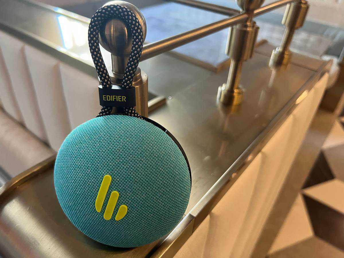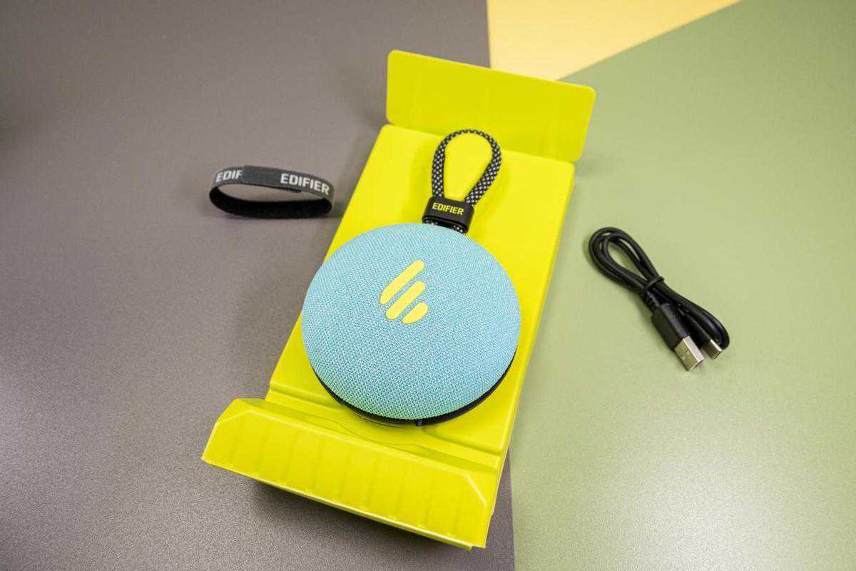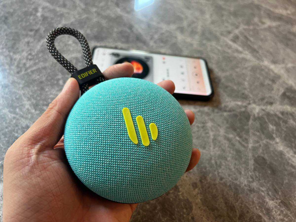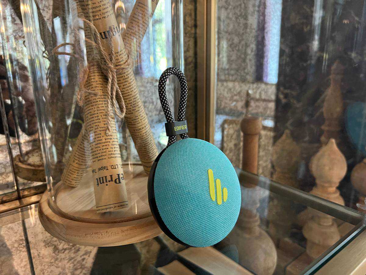 扁圆造型的小音箱,正面包裹了一层织物面网,触摸上去手感很舒服。底壳采用了双色注塑工艺,顶端还有一根结实的挂绳,方便我们挂在包包上,或者它挂在帐篷、树枝上。小巧的体积,手掌心可以轻松应对,机身仅重185g,出门携带非常方便,不愧为便携式音响。