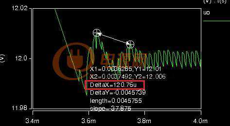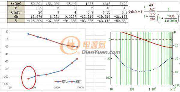 3、记录下当前输出的震荡频率,由比例P和电容大小可算出补偿电路的增益|G|和相位θ,可以得出功率级电路的增益为1/|G|、相位-180-θ。