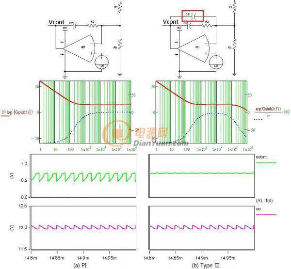 PI补偿中由于没有高频衰减补偿电路的输出Vcont=△Vo*R2/R1所以比例P(R2/R1)不能设置的过高,TypeⅡ型则不用考虑这个问题可以更灵活些,当取高频极点无穷远时TypeⅡ型就等同于PI补偿。