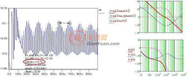 第三步,上一步推测的功率级电路穿越频率约为1000/1.8999=526Hz,最终的目标穿越频率设为8Khz,此时调制比例系数P=8000/526=15(斜率有可能是-1和-2的组合所以P的取值范围15~30)。重复上述第二步调积分电容使震荡波形达到满意状态为止。