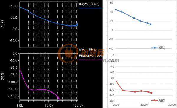 用Saber软件对上述推论进行验证,在验证过程中发现当高增益时单个高频极点虑不掉开关噪声所以需要设置双重极点(双重极点20kHz,开关频率60kHz,右半平面零点30kHz),仿真和计算的结果对比如下: