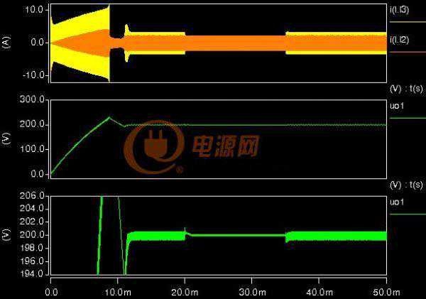 图2-5-4为LLC输出动态波形及局部放大图,在刚上电时为大信号状态环路未起作用,后面当环路起作用后负载的动态特性较理想(负载138-1380欧姆0.01mS突变)。