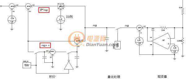 数字PID是通过AD采样输出电压再经过芯片的逻辑运算来实现的,在Saber软件中没用过MCU类的芯片如果纯粹用分立逻辑电路来搭电路会过于庞大,这里采用模拟运算器来模拟数字信号的处理,电路如下: