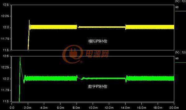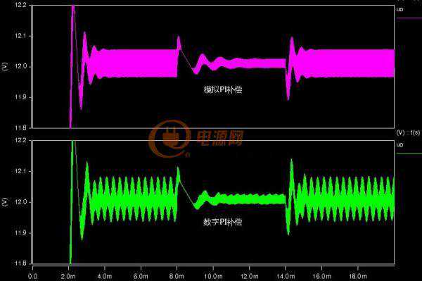 模拟补偿参数:P=1,KI=10^-5,数字补偿参数:P=1,fki=10^6。二者的仿真结果对比如下: