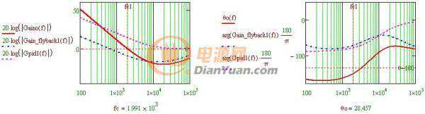 有了功率级bode图后剩下的补偿就容易实现了,采用图解法设置目标穿越频率20kHz相位余量45度得出的TypeⅢ型补偿电路各参数如下: