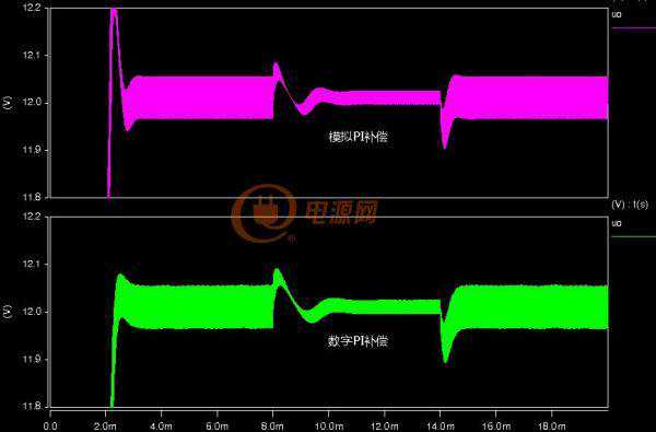上述数字环路2.8kHz震荡是由于采样频率太低的缘故,拓扑为反激开关频率60KHz,数字累加的采样频率为31.4kHz,当提高采样频率到314kHz(同时△u*0.1)后震荡消失,仿真对比如下: