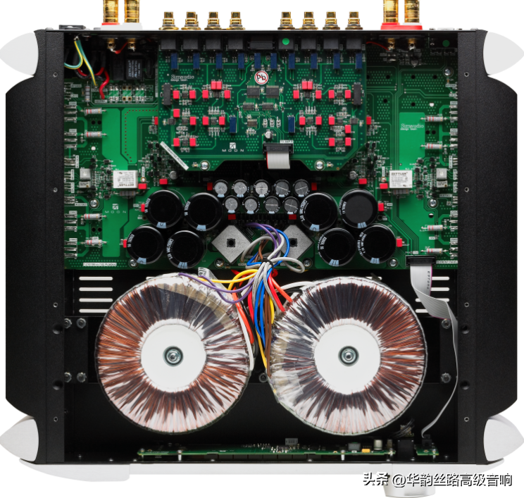 由600i進化至600iv2,新版每聲道功率輸出仍然是125W,首5W為純A類輸出。別看整個機箱僅厚10.2cm,重量竟達21kg,重工機箱連散熱器不能少覷!依然保持著四組RCA輸入、一組平衡輸入及一組左右聲道各一顆LFE,輸出接兩台超低音。内部,貫徹600i雙單聲道設計,兩個300VA環牛(低磁漏、低電漏及低溫)獨立供電至左聲道。變壓器後,是共40,000µF電容儲備(每聲道20,000µF),兩側板是兩份放大模組連散熱器。內部電路板同樣採用Simaudio出品的四層結構,主要採用SMD表面黏著元件。前級以OPamp作訊號放大,後級採用差動式輸入,後級放大用SIMAUDIO自家出品的雙極功率管……其實,改變在哪?