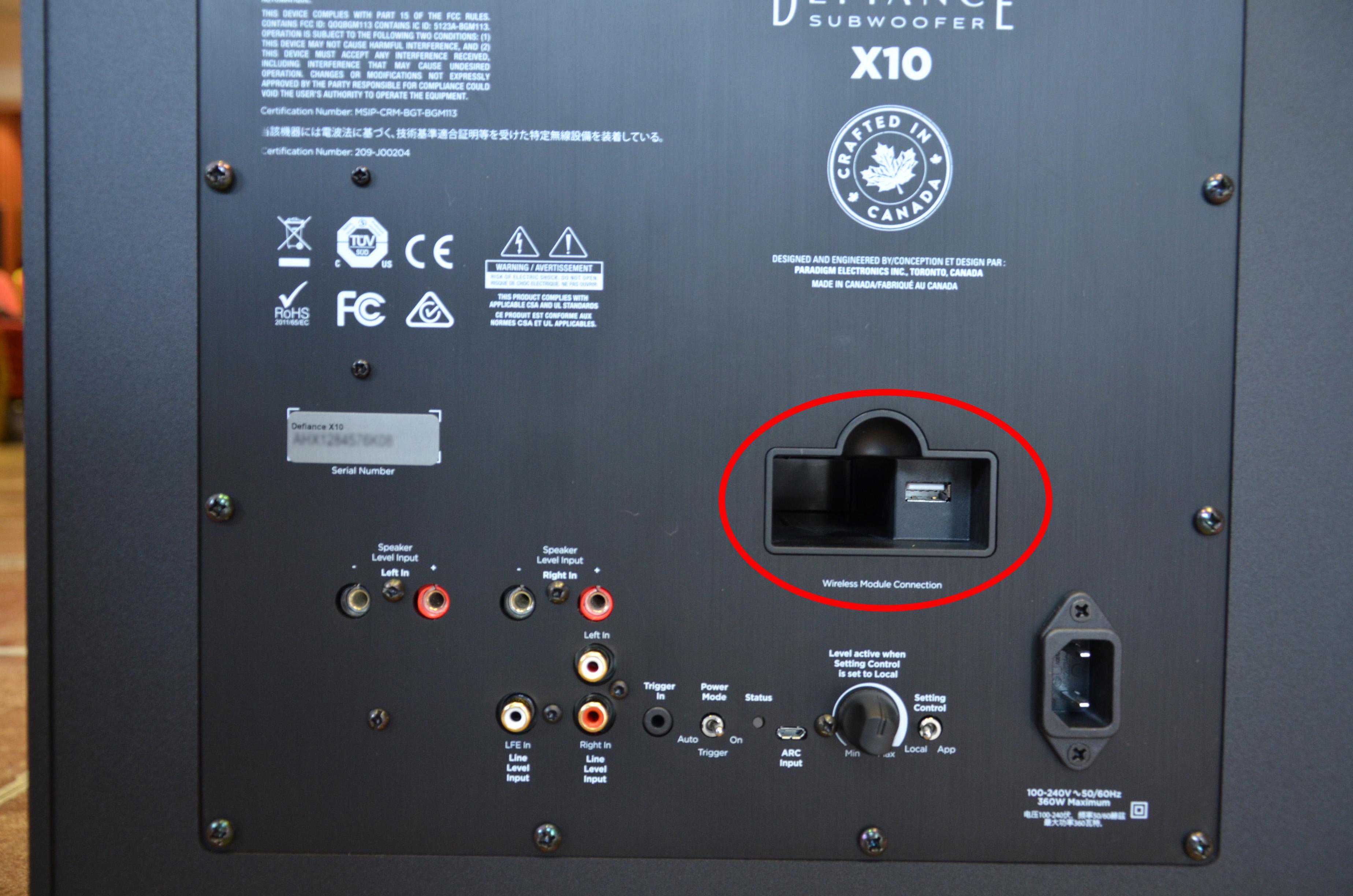 X10背后有一个槽,是该系列低音炮外置无线模块的位置,这个无线模块需要另外购买哦。当然除了X10有,X12和X15也可以用哦,V系列的除了V8,其他两款也可以使用