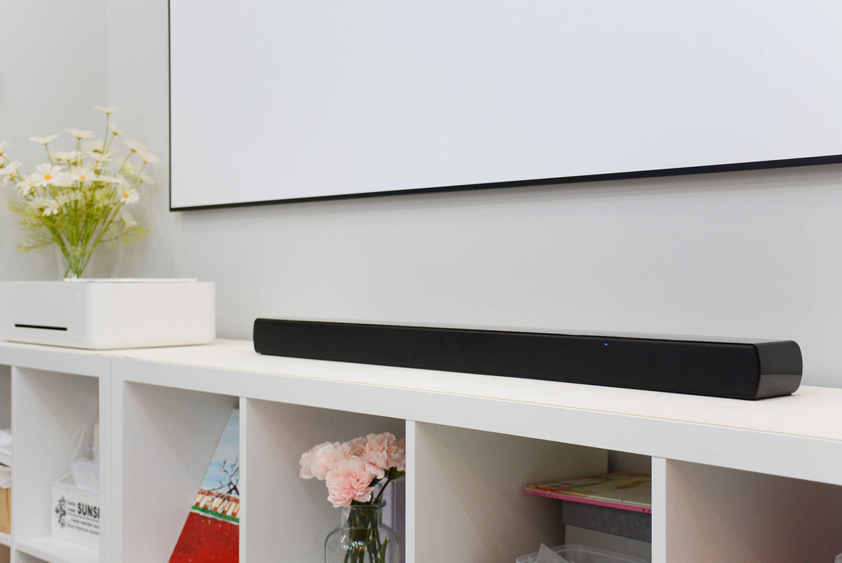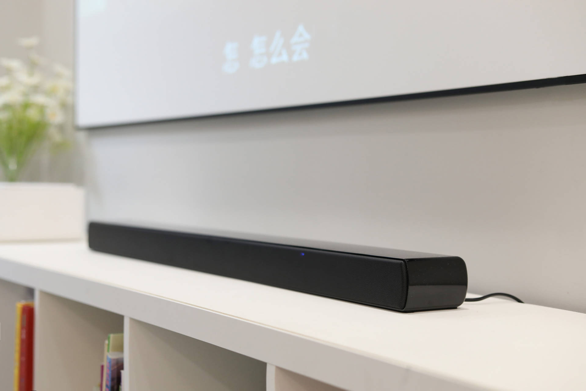 这是一台“一体式2.0回音壁”音响,它没有独立的低音炮,而是把低音单元内置到了音响里面,因此整个音响就是一个简单的长条。这样摆在我家的投影幕布下面,我感觉比有独立低音炮的音响更简洁大方,而且还能节省空间。它其实还送了上墙套件,根据需要可以把它挂在墙上,例如我家的幕布下面,或者是有液晶电视的话,可以挂在液晶电视下面。