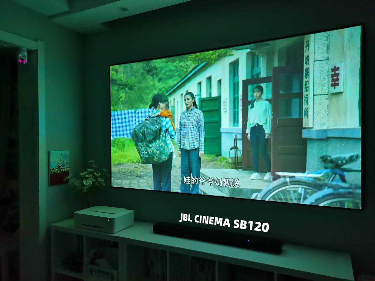 尽管说出来可能你会质疑,我的这个小投影分辨率只有480P,画面离近了看其实有明显的颗粒感,效果非常不好。不过,我认为所谓的家庭影院其实只求一个视野,画面够大就很不错了,分辨率什么的都可以将就,而声音这东西是不能将就的,好听就是好听,单薄就是单薄,当我连接上JBLCINEMASB120之后,那种环绕感、立体感,直接把我的小投影缺点掩盖掉了。举个例子:我最近在恶补《人世间》,里面很多的人物交谈场景都像是发生在身边一样,左边的人和右边的人说的话能明显感受到方向,真的就是这种感觉。
