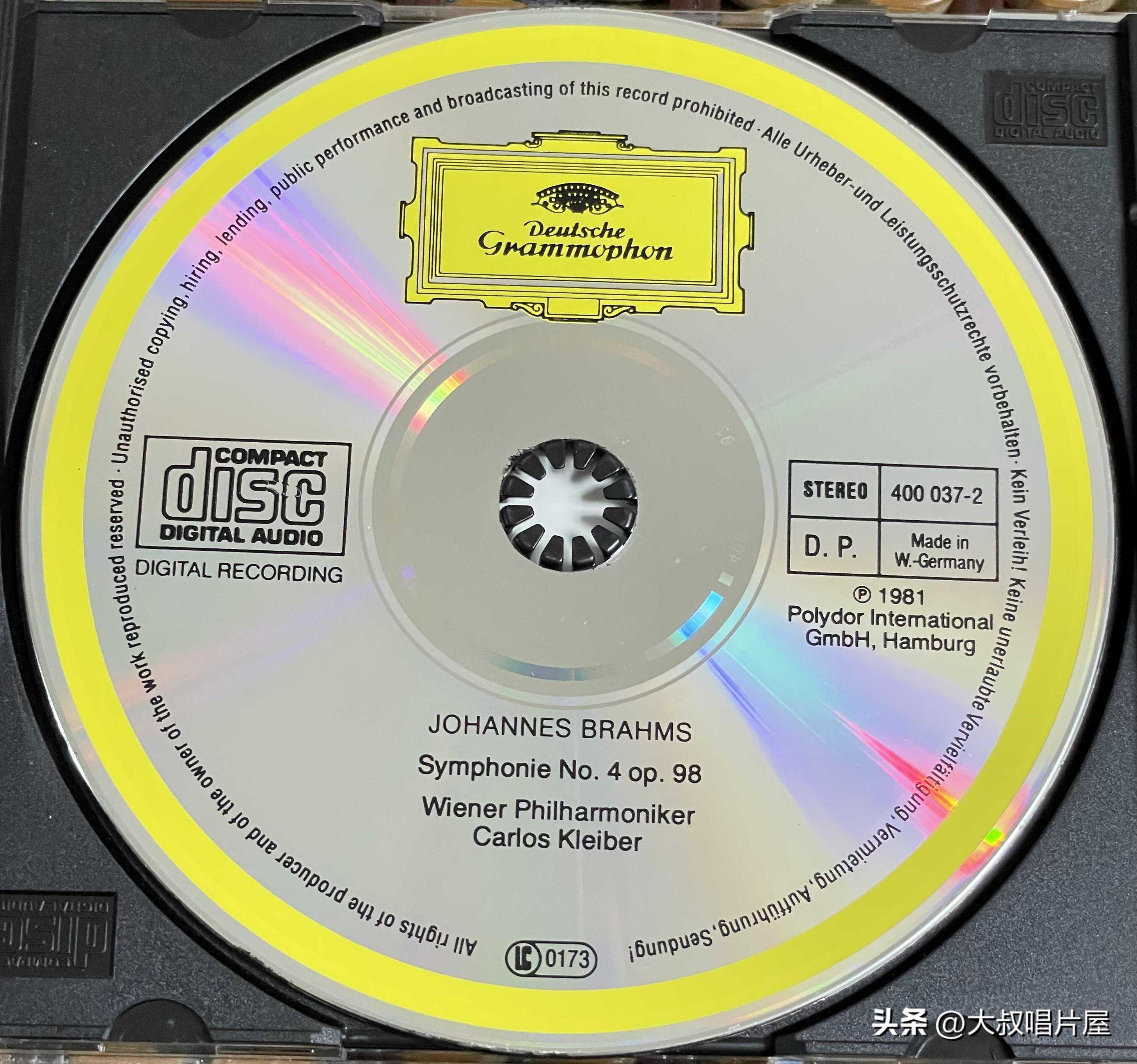 15、勃拉姆斯–第四交响曲卡洛斯克莱伯指挥维也纳爱乐乐团唱片编号:DG/400037-2收藏版本:1983年欧首版(西德无字银圈),这张是我在某宝上捡漏的,封面是98年“TheOriginals”系列的封面,里面的CD碟片却是早期的西德无字银圈版。