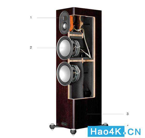 整个Gold300喇叭箱体使用18mm厚重的MDF製作,内部还加上强化结构,去除喇叭箱体振动的音染,单体背后还有粗壮的螺丝,撑在音箱前后锁定强化,目的同样是抑制振动。还有,Gold300的双低音单体,内部其实是独立音箱,让两个低音单体各自独立工作,不相互干扰。其实谈到这里,不管是单体或喇叭箱体所採用的新技术,Gold300的设计理念很清楚,就是要降低失真、减少音染。
