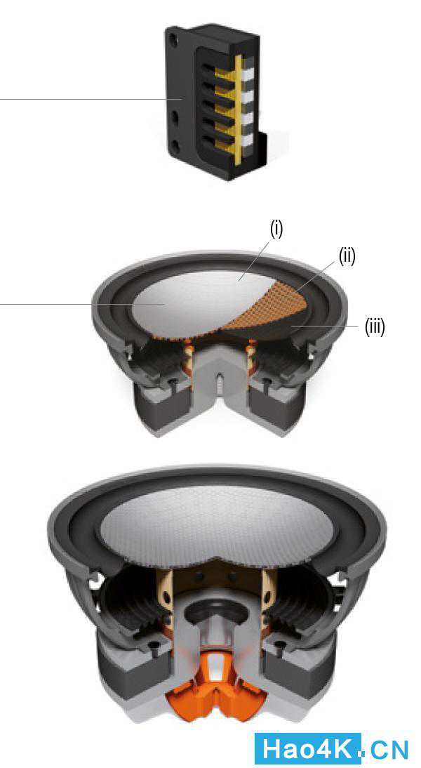 为了搭配Gold300全新设计的中高音模组,MonitorAudio加上了双8吋RDTII中低音单体,技术又是延续Platinum,RDTII的振膜採三明治结构,表面是C-CAM陶瓷铝镁合金,中间是蜂巢结构的Nomex材料,后面加上碳纤维编织材料,靠三种材料贴合成质量轻又具备高刚性、高阻尼的RDTII振膜。