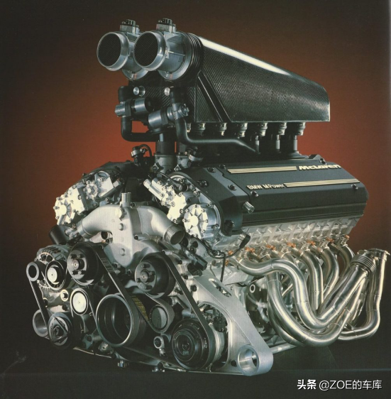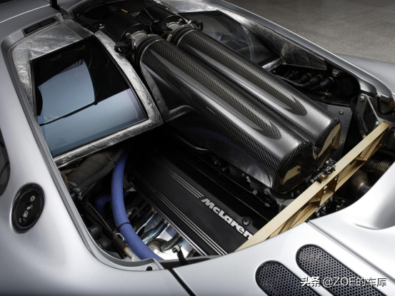 图:McLarenF1的进气布局在当时而言非常具有开创性,不同于法拉利或者保时捷那样的从车侧进气方式,它采用了类似于一级方程式赛车的车顶进气的方式,空气直接灌入碳纤维风箱内,然后每气缸一个单独的节气门控制进气量。