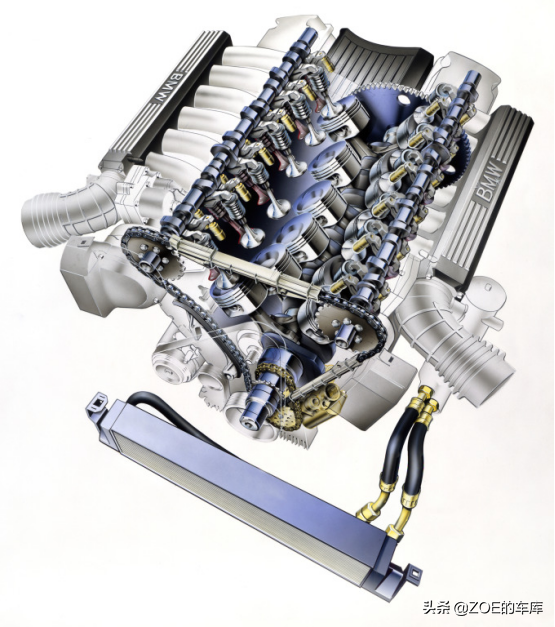 图:即使放在850CSi上使用的S70B56引擎,配气机构还是单凸两气门配置,只有到了M8原型车上的S70/1才拥有双凸,只是它并没有被投产,而S70/1的很多技术被放到了S70/2上使用。