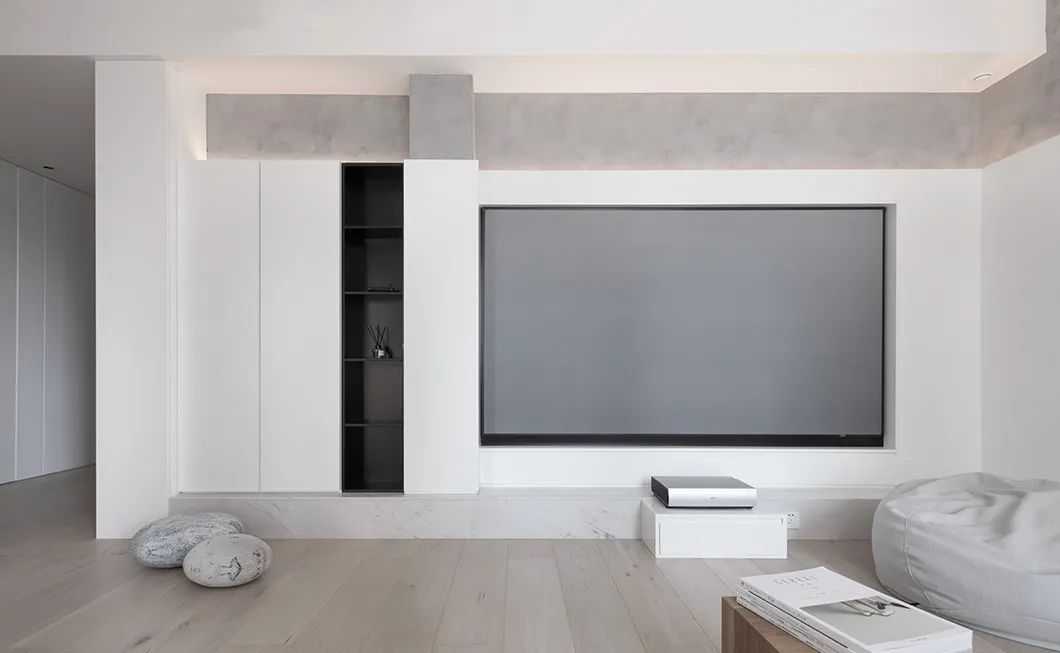 100寸的巨幕投影,嵌入式的格子柜,MUJI风格的懒人沙发,散发着慵懒舒适的氛围。客厅与餐厅串联,空间视野最大化,多面采光进入空间,房间通透明亮。