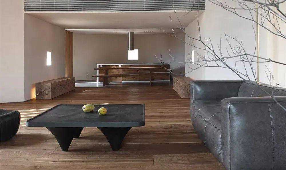 家本是人的生活居所,也是获得精神给养的休憩之地,低矮的真皮沙发,形如倒置山水的茶几,裁剪过的枯枝,待客也犹如在山水之间怡然自得。