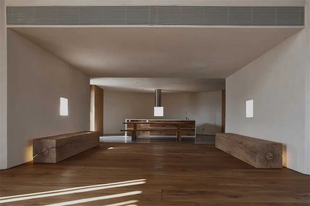 石头、土、木、植物,完整而原始的要素容纳进一个空间。开窗比例、角度及栏杆的设置都经过细腻的推敲。当阳光投入屋子里面,慢慢在家具和地板上移动,光影形成不断变化。