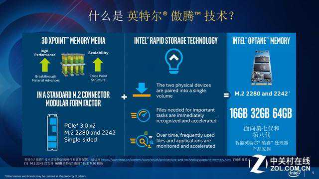 具体来说,傲腾内存包含两种技术,一是3DXpoint,二是RST快速存储技术。前者拥有千倍于NAND的速度和耐用性,后者可以把两个不同的物理盘整合成一个操作系统可识别的逻辑盘,并且还可以快速判别哪些文件会被调用、哪些文件被大量频繁使用,从而对这些文件进行标记、留存,为加速做好准备。