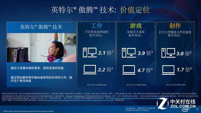 那么基于3DXpoint介质的傲腾内存究竟性能如何呢?我们在之前也做过很多测试了,结论无一例外——通过傲腾内存加速后的机械硬盘从使用体验上基本可以媲美固态硬盘。英特尔的说法是,相比于机械硬盘,配备傲腾内存的台式机在工作中有2.1倍的提升,笔记本有2.2倍。游戏方面台式机有3.9倍的提升,笔记本有4.7倍。创作方面台式机有3倍的提升,笔记本有1.7倍。总之,配有傲腾内存的设备相比机械硬盘都有非常明显的速度提升。