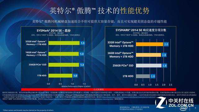 傲腾内存相比于SSD呢?英特尔用SYSMark软件测试的结果是,总分方面,32GB傲腾内存+1TB机械硬盘、16GB傲腾内存+1TB机械硬盘和256GBPCIeSSD的分数是一样的,都是1.3,而1TB机械硬盘的分数为1,也就是说,傲腾内存+机械硬盘的速度可以和SSD处在同一水平。单看SYSMark响应速度分数的话,傲腾内存+机械硬盘还是可以和SSD保持在同一级别,32GB的傲腾内存还有小幅的领先。