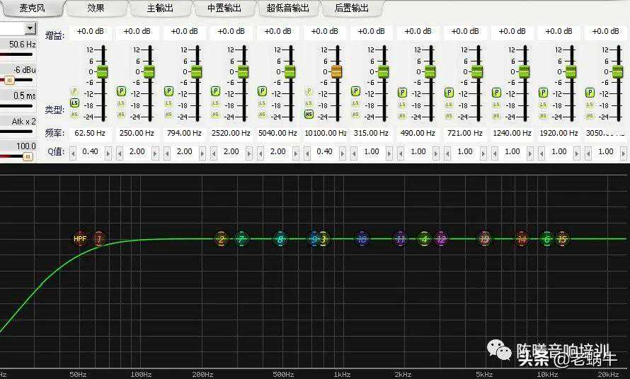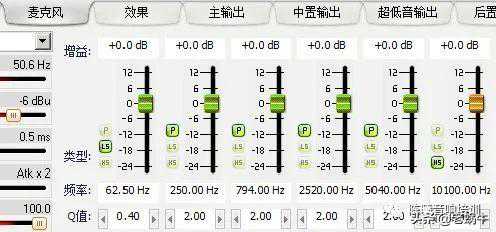 4、调整均衡器,调整输出通道的均衡器不是为了把声音调好听了,而是要通过测试把音箱的频响缺陷找出来,用均衡器把频响特性调平了,一来提高系统还原性,便于后续的调音工作,二来可以在一定程度上降低话筒啸叫现象产生的可能性。