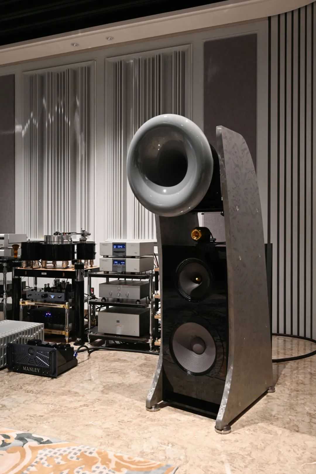 号角,是最传统的喇叭,至今仍被认为是声音重播的最好方式之一,有极高效率、高还原度的优点。然而,因为物理体积限制,对于低频段的还原一直并非号角所擅长。以前的电子管放大器输出功率很小,必须用高效率喇叭搭配使用,盛极一时的古董号角喇叭至今也有不少玩家,在世界各地淘品相和状态好的,声音也是非常不错的。而真正的现代化号角扬声器,需要依靠最新的材料学、最尖端的计算机数字建模等高科技手段,才能将号角扬声器理论上的优点发挥至极致。