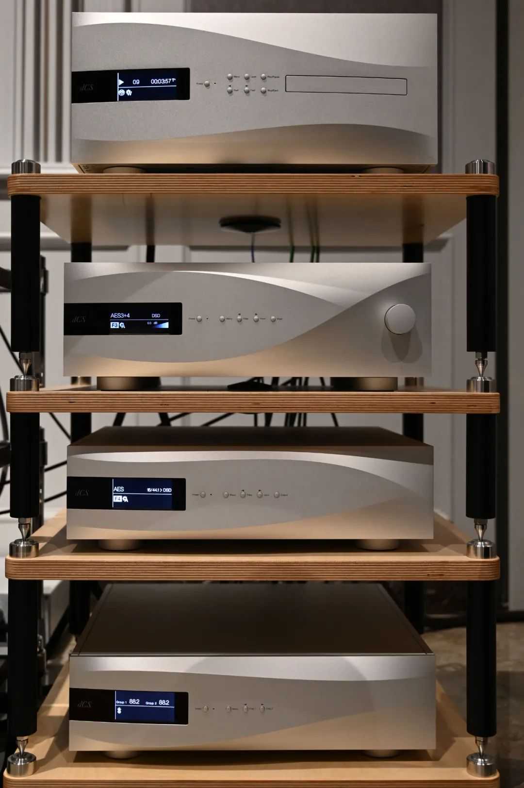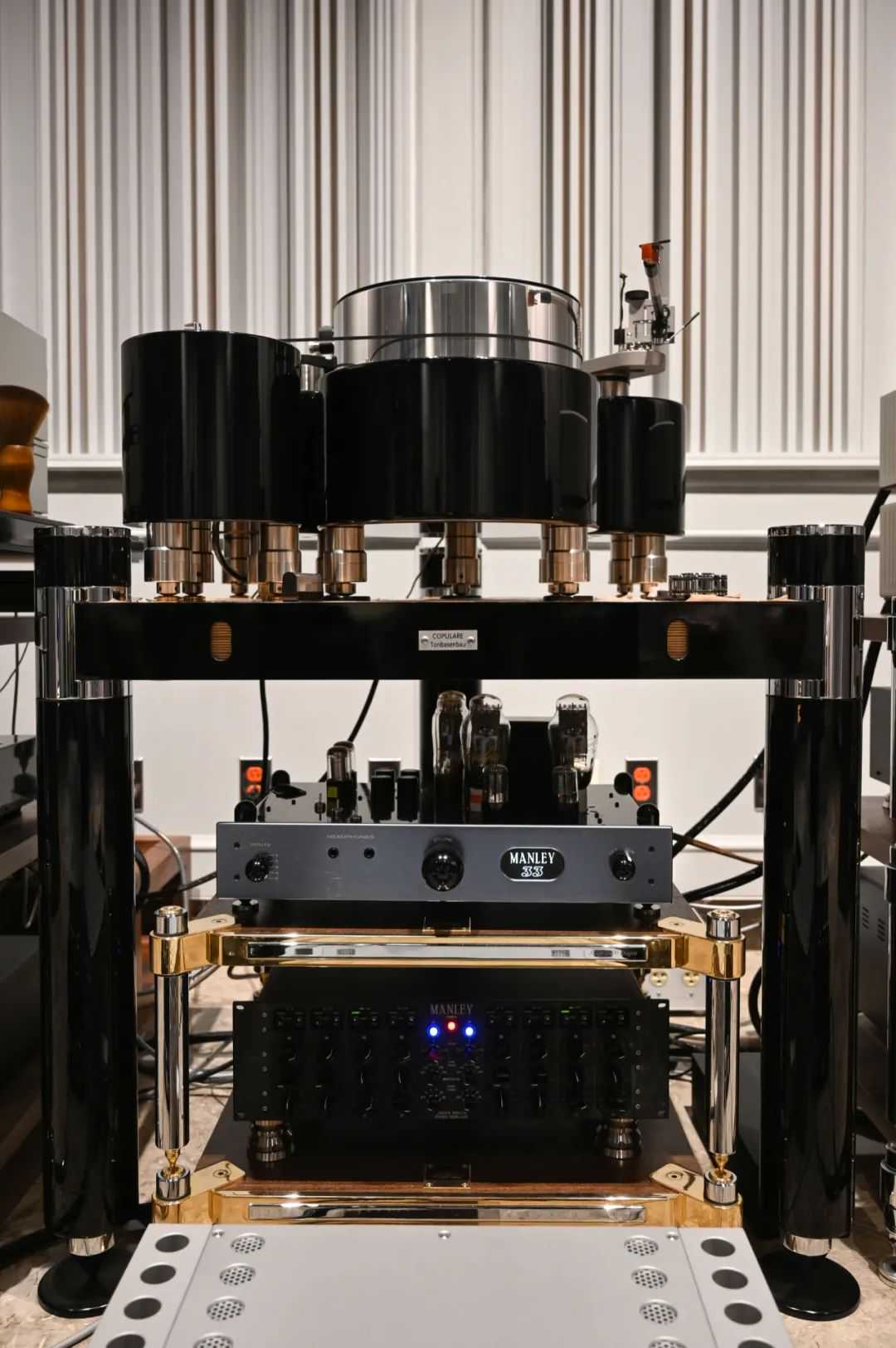 推动Cessaro(西萨罗)AlphaⅢ的是一套美国专业大厂MANLEY前端系统,包括MANLEY33旗舰前级、每声道十只KT88电子管输出功率达到500瓦的MANLEY88单声道后级,还有电源分体的MANLEY唱放,MANLEY专业EQ,音源系统包括DCS全套四大件等,一台几瓦的胆机就能轻松驱动这对巨大的Cessaro(西萨罗)AlphaⅢ,那么怎么还用得到每声道配置10只KT88电子管、输出功率达到500瓦的MANLEY88单声道后级呢?但听过之后我发现这样的搭配声音也是非常好的,通过与乐派影音吴先生的交流,我知道他的听音取向,AlphaIII庞大的动态、鲜活的氛围感、空灵通透的中高频正合他的口味。实际上我在乐派听到的Cessaro(西萨罗)AlphaⅢ声音不是发烧友经常形容的宽松,而是轻松流畅,一点压力也没有,吴先生播放的也是古典乐中的优秀录音,整套系统动态庞大却不刺激,尽可能的接近现场音乐会那么大动态,虽然大家都知道再贵的音响也不可能完美的还原现场的,但尽量接近现场总是有的,微动态和大动态表现都非常出色,中高音不食人间烟火的感觉,再次重复,就是全频段声音都很流畅轻松。即使是这样,吴先生告诉我,这套系统现在播放斯坦威钢琴还没达到最完美的境界。我问他,斯坦威钢琴在不同音乐厅有不同音色,在不同演奏家和不同录音师的二度创作下也有各自的风格,如何判断斯坦威钢琴的声音是完美的?吴先生说,他跟一些音乐家们、钢琴调律师经常有往来,他向他们学音乐,音乐家们向吴先生学音响,斯坦威钢琴低音跟其他钢琴不一样,是先朝地面打然后才向四周扩散,不仅如此,还要能区别出不同演奏家不同录音空间的斯坦威音色,在我们听来已经非常棒的一套系统上,Cessaro吴先生对于声音的苛求同比如德国Cessaro(西萨罗)的设计师对声音的苛求一样,实在难得!