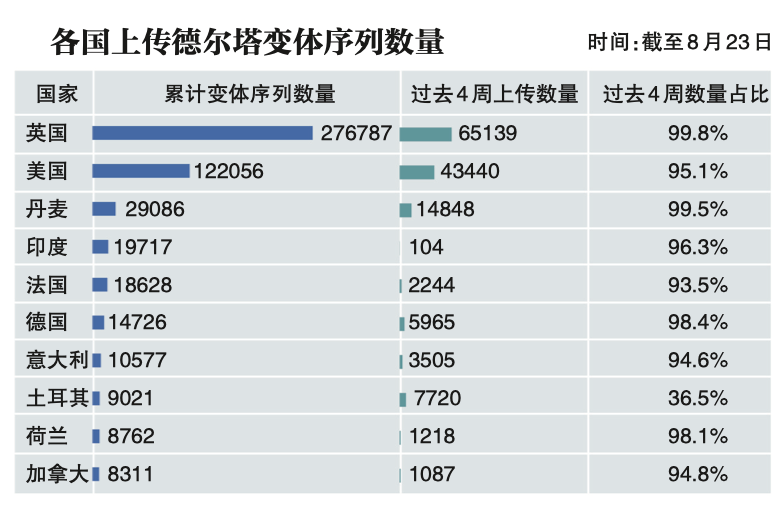 具体到各国上传到GISAID的变体序列数量中,截至2021年8月23日,英国的德尔塔变体组序列总数最多,累计达到27.67万,过去4周内提交数量超过6.5万,占比达到99.8%;其次为美国,累计超过12万,过去4周内提交数量为4.34万,占比为95.1%;第三为丹麦,累计达到2.91万,过去4周内提交数量为1.48万,占比为99.5%;第四为印度,累计达到1.97万,过去4周内提交数量为104,占比为96.3%。