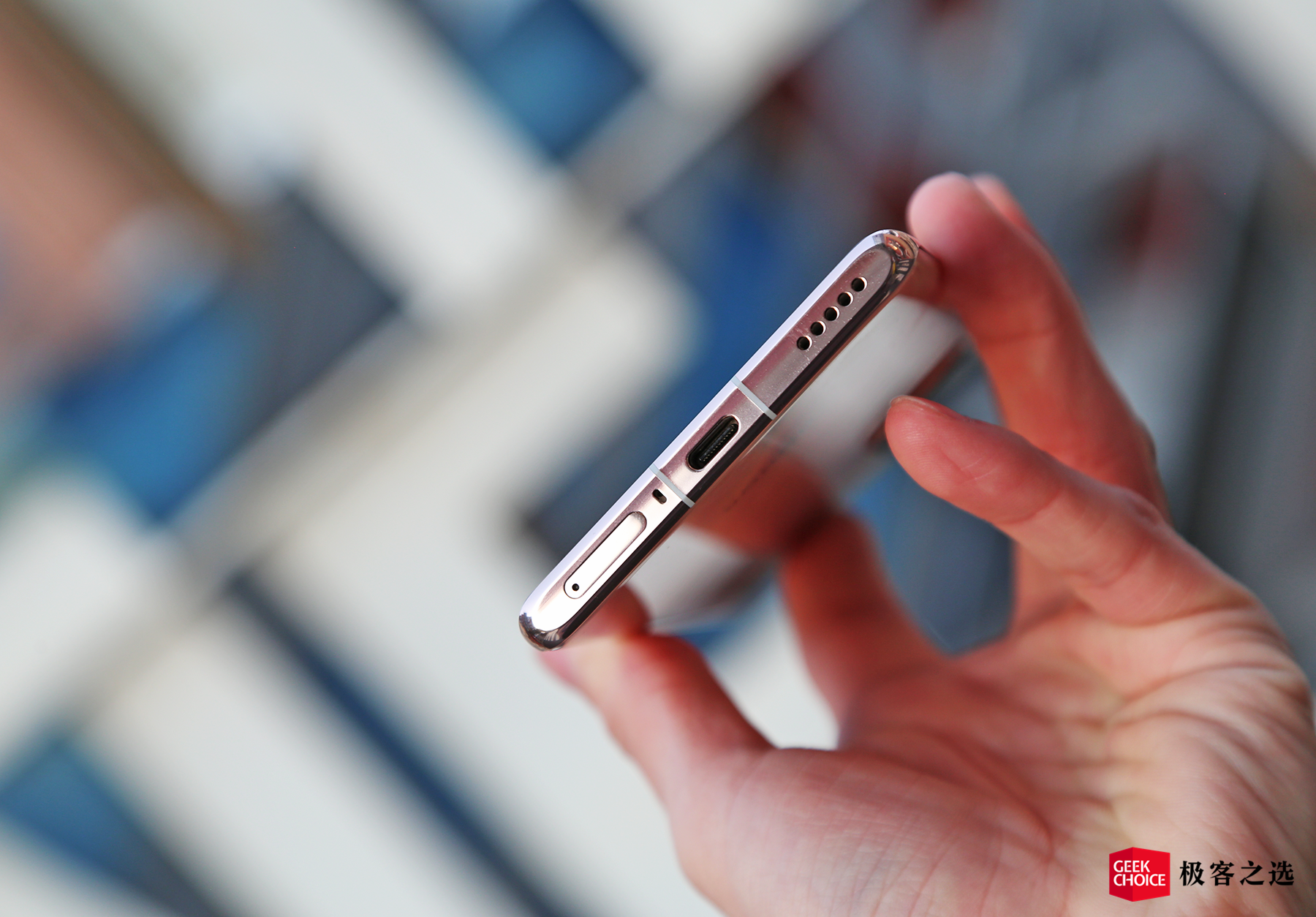 正面可能不太明显,但将视角转到侧面可以清楚看到,实际上它的屏幕两侧与中框连接处,设置有和上边框几乎等宽的黑边,同时由于屏幕边缘伴有一定倾角,握持手机时,手指并不容易直接接触到屏幕有效触控区域,所以大可不必担心会因为误触而影响到正常使用体验。