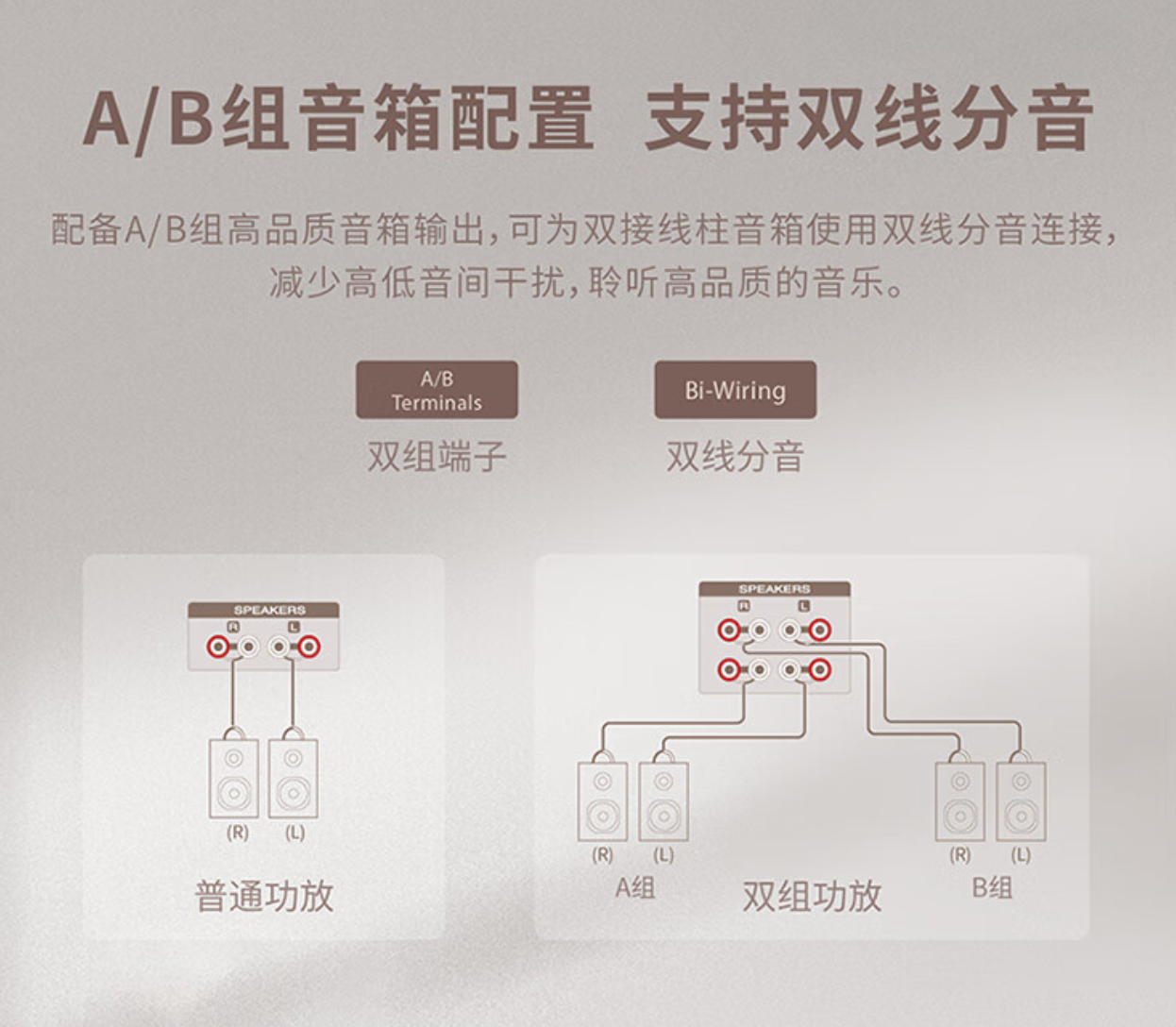 PM6007音箱输出支持双音箱输出,或者是使用双线分音输出,进一步降低失真。而上面说的宝华韦健606S2正是支持双线分音输入的,只需要摘掉背后两组接线柱中间的链接铜片,用2条音频线接入,就可以实现中低音和高音分别驱动,进一步降低干扰,降低失真,带来更好的回放效果。