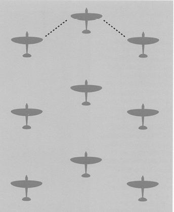 1938年英国皇家空军正式公布的《空中战术手册》中制定六种标准中队战斗区域攻击模式,英国皇家空军标准战斗机编队是三架飞机组成的V形编队,一个由12架飞机组成的中队分为A和B两个飞行段,这些飞行段依次由三架战斗机组成。当处于全速战斗编队时,所有12架飞机将被紧密地分成四个部分,每组3架战斗机。领头长机负责搜寻敌机,其他飞行员严格保持编队位置,彼此掩护,但视野受限。这种死板的队形飞行表演或者演习很漂亮,上战场就悲剧了。