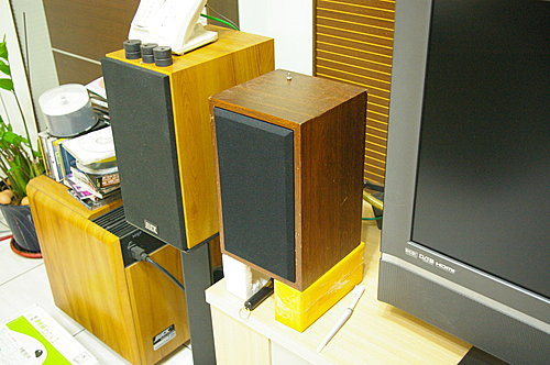 客厅有2套系统,一套是环绕音响,看电影用,一套是每天听音乐用,先介绍最常用的后者,讯源是马兰仕的7001sacd播放器(下图一上),或是计算机foobar2000+创巨uab+阿仁1541ADAC(下图一下左),扩大机是colin的12b4(下图一下右),送去改可以选择2组讯源,也取其推力比5687s大),喇叭是仿制的3/5a(下图二,本来放2颗并联的colinsp-20,后来为了美观换成这组,没想到效果不错)。