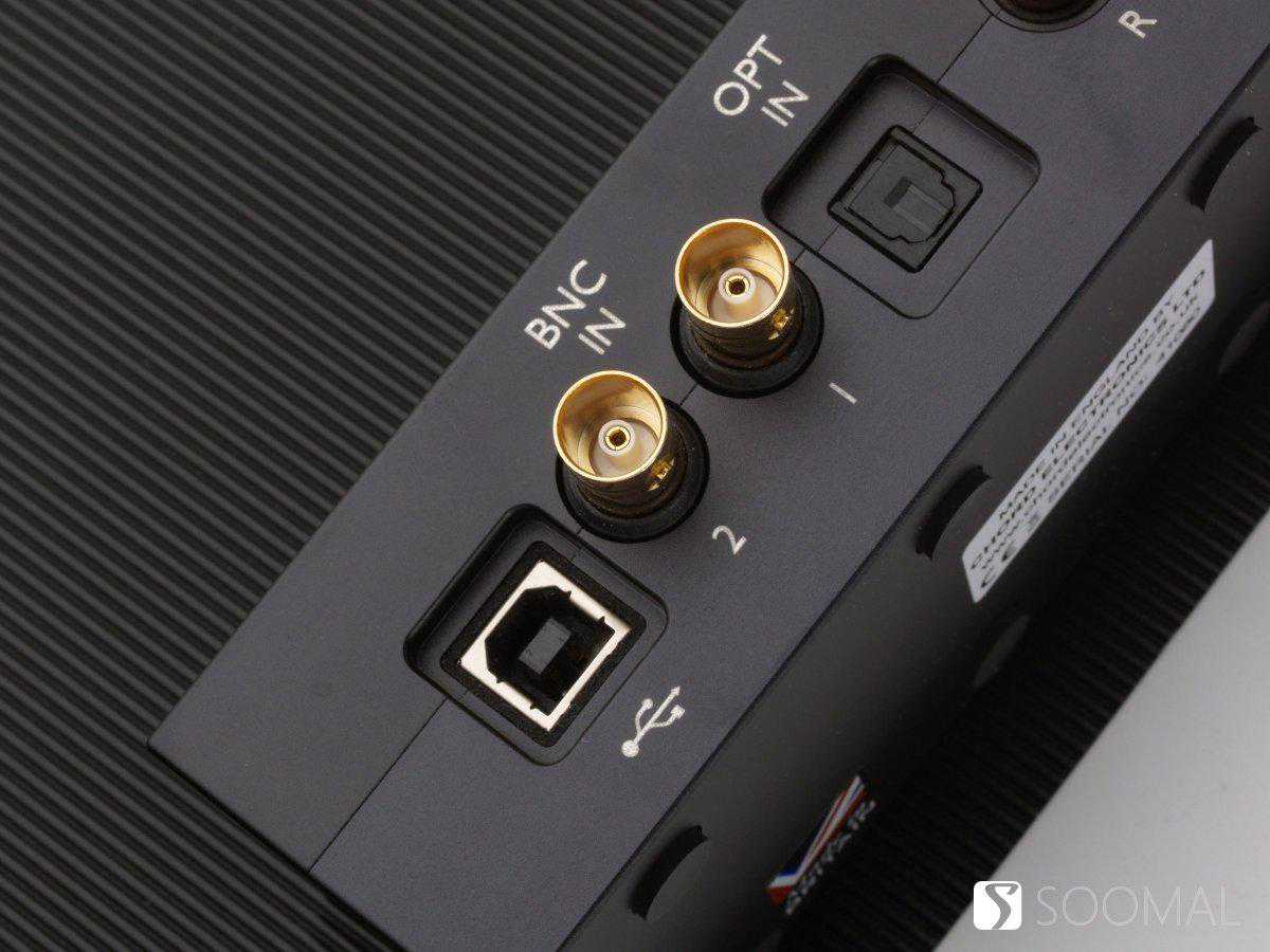 QUTEST支持USB和光纤、BNCS/Pdif信号输入。USB输入下支持最高DSD512和PCM768kHz的解码,BNC有两个接口1和2,由于S/Pdif的在单个BNC或RCA同轴下只能最高到384kHz,所以两个BNC组合可以合并实现768kHz的外接输入。不过这套做法似乎只有CHORD自家的CD机和硬件SRC升频机器可以实现。两段式可合并S/Pdif输入的功能在HUGO2上也有,通过一个3.5mm3段转接巧妙实现。