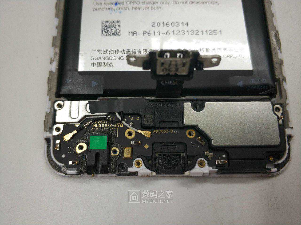 拆后看到里面有两个排线位,从左到右为连接小板排线和Microusb充电座排线