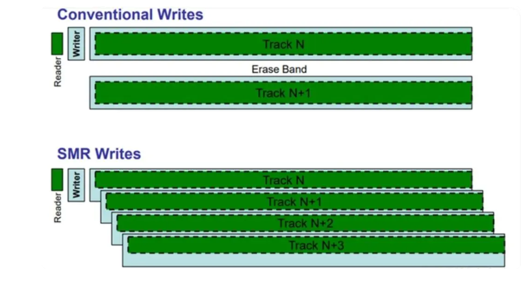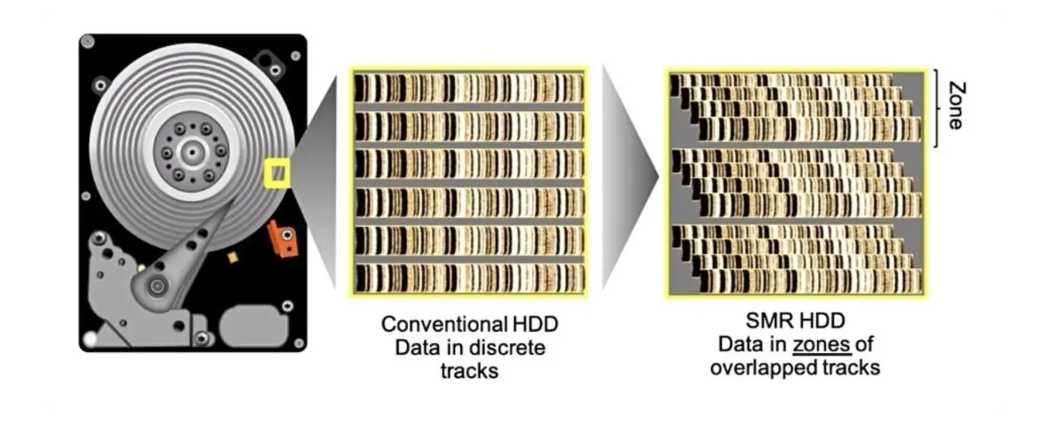 同样的,由于磁盘空间有限,当垂直式堆叠出现技术瓶颈时,改变堆叠方式的叠瓦式机械硬盘随之发展了起来。它也称之为SMR,其使用叠瓦状的数据轨道布局,其中相邻数据轨道之间有部分重叠。这种布局可以提高数据存储密度,但在写入新数据时需要对重叠的数据进行重新排列,可能导致写入性能下降。