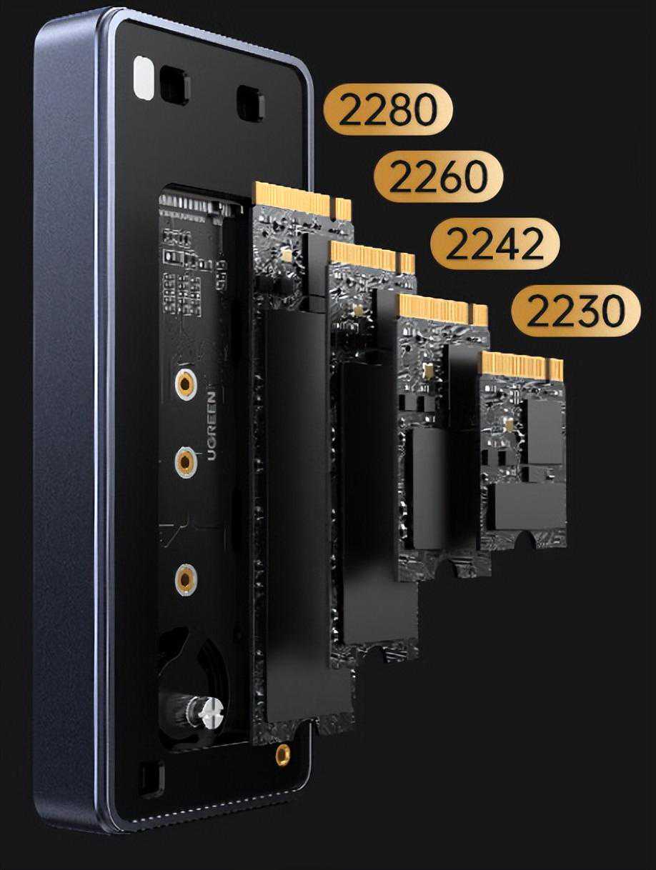 在固态硬盘选择上可以匹配硬盘盒的兼容尺寸,比如绿联固态硬盘盒(CM642)就支持2280、2260、2242、2230四种不同尺寸的固态硬盘。运行速率高达40Gbps,持续读取速率高达3600+MB/s,理论性能下相当于3G大小的文件只需1秒就能完成传输。