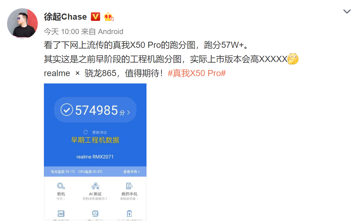 realme徐起表示:看了下网上流传的真我X50Pro的跑分图,跑分57W+。其实这是之前早阶段的工程机跑分图,实际上市版本会高XXXXX,realme×骁龙865,值得期待!