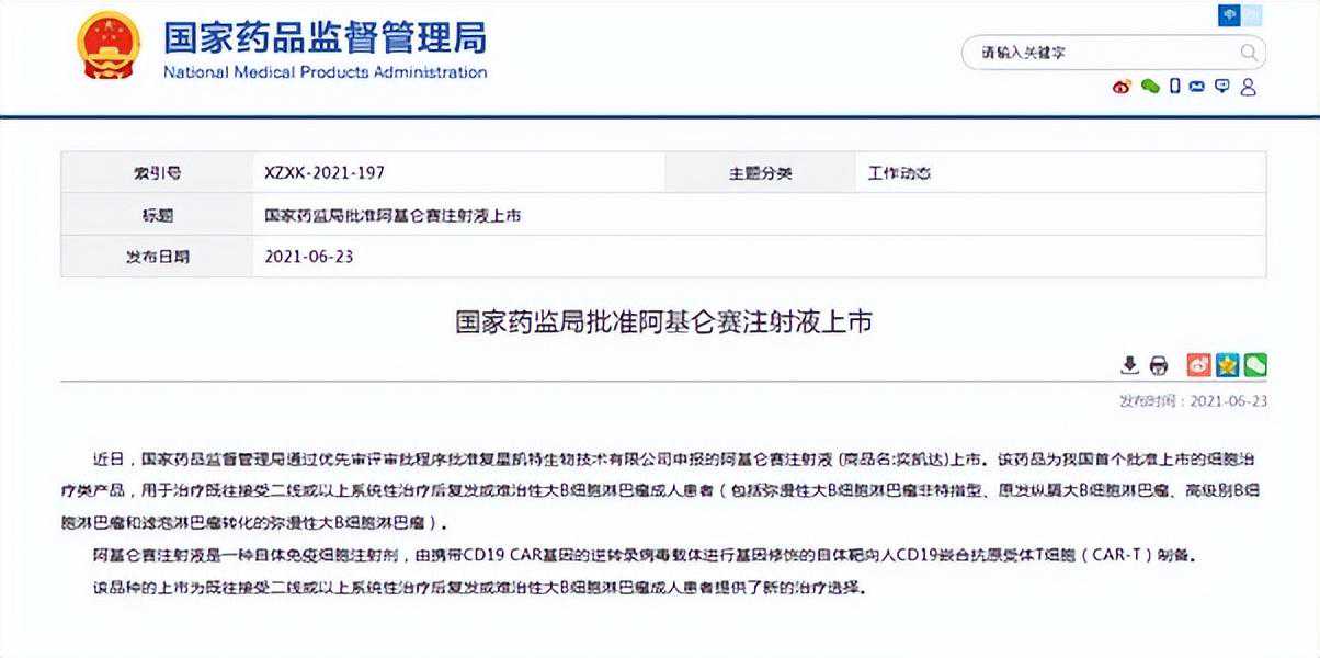 戴阿姨成为2021年6月我国首个获批上市CAR-T药品的深圳首位应用者,且在治疗后病情得到了完全缓解。