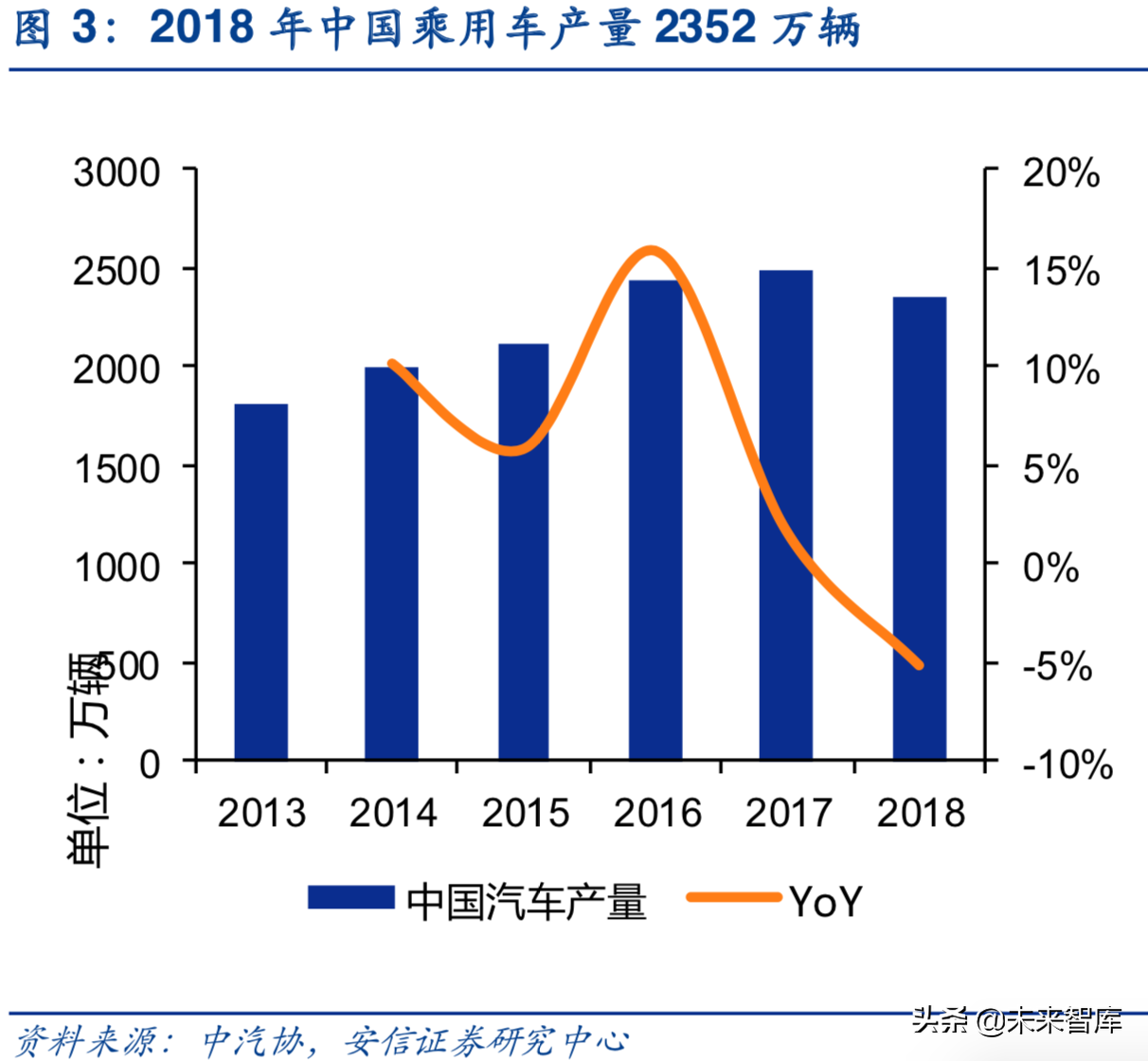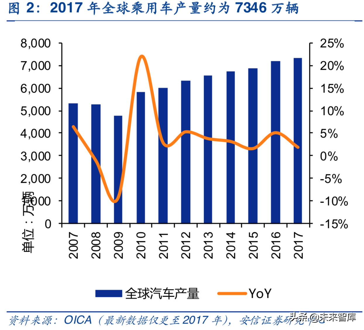 近年来全球汽车总产量呈缓慢增长态势,根据OICA最新数据,2017年全球乘用车产量约为7346万辆,同比增长1.9%,受2017年购臵税即将退出导致的销量高基数及2018年宏观经济下行影响,根据中汽协,2018年中国汽车产量约为2352万辆,同比下降5.2%。尽管下游整车增速放缓,但基盘依旧庞大,为汽车电子行业规模提供了强有力的需求基础。