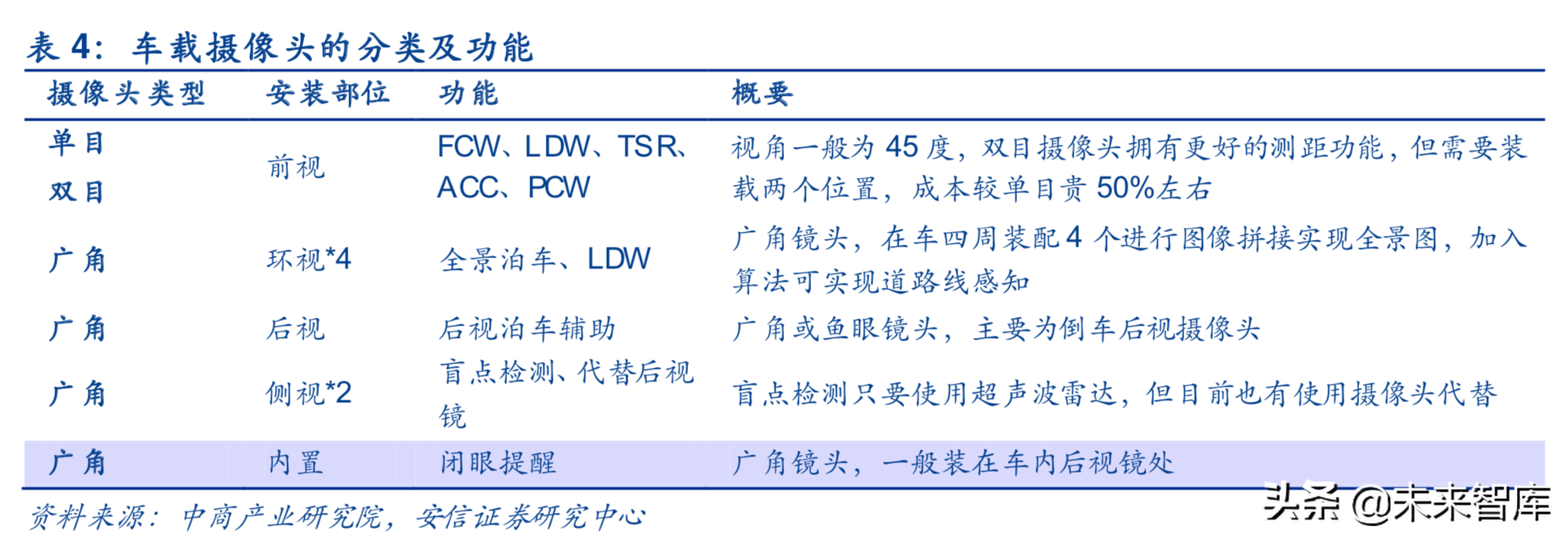 车载摄像头是ADAS系统的视觉传感器,可以应用于泊车辅助和行车辅助等多场景。车载摄像头主要包括单目摄像头、双目摄像头、广角摄像头等,目前实现无人驾驶的全套ADAS功能至少需要安装6个摄像头,分别是1前视摄像头、1个后视摄像头和4个环视摄像头。通常后视摄像头是低阶ADAS系统标配的传感器,与超声波雷达配合,主要用于低速的泊车辅助,侧视摄像头通常为2个广角摄像头,通常用于BSD和电子后视镜,但是中国法律当前尚不允许使用电子后视镜,环视摄像头一般为4个广角摄像头,主要应用场景就是360环视和全景泊车,主要是通过将4个摄像头的图像进行拼接后形成一幅完整的全景图像,前视摄像头通常为1个,双目效果会显著好于单目,目前主要是用于FCW和TSR等行车辅助系统,未来随着算法的精进,与毫米波雷达配合,还可以实现ACC和AEB等ADAS系统。