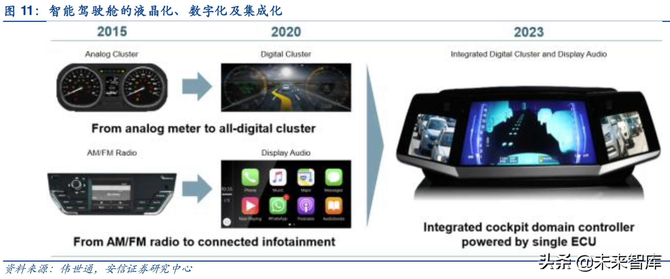 智能驾驶舱正处多屏集成阶段,未来将迈向智能驾驶集成。智能驾驶舱的集成化可分为三个阶段:1)单一座舱电子,主要由中控平台构成,仅提供多媒体娱乐功能;2)中控平台、仪表盘等系统集成,主要由液晶仪表盘、中控大屏、HUD、后座娱乐等构成,可实现智能交互、车辆管理等功能;3)智能驾驶集成,主要由控制系统、执行系统构成,可实现自动驾驶功能。目前正处在第二阶段普及期。根据伟世通,2023年便可形成一芯多屏的中控平台集成。