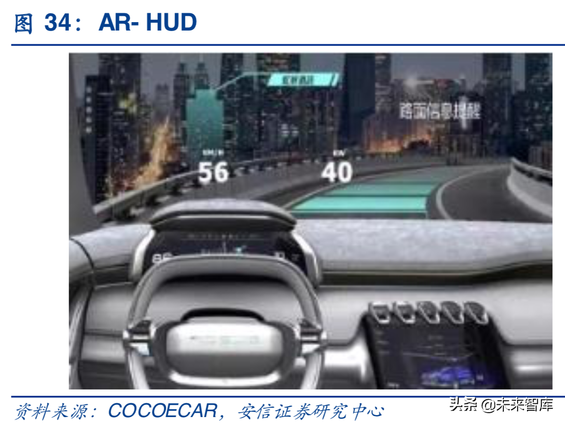 HUD即抬头显示器,是HeadsUpDisplay的缩写,是目前普遍运用在航空器上的飞行辅助仪器以降低驾驶员低头查看仪表的频率,避免注意力中断以及丧失对状态意识的掌握。在大尺寸中控屏尺寸备受追捧的当下,车载显示产生了分散驾驶员注意力的安全隐患,车载HUD应运而生,最早出现在80年代末,随即2001年、2004年通用、宝马分别推出彩色HUD,随着技术逐渐成熟,HUD目前已普遍运用在豪华车上,部分日常家用汽车亦有装载。