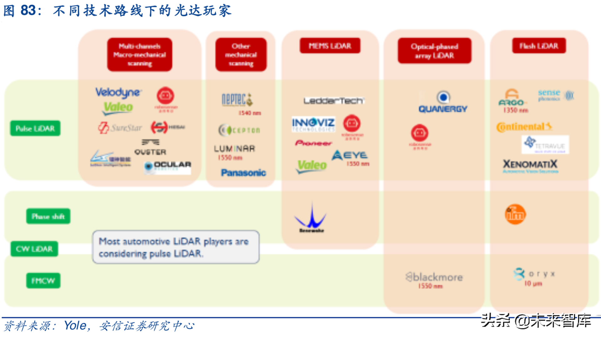 在技术方面,大多数现有产品使用波长在830-940nm之间的激光束进行机械扫描。MEMS扫描仪有望成为汽车LiDAR的下一代发展方向,体积更小,更便宜。Quanergy公司提出了一种源于光纤通信技术的光学相控阵方案,成本低、体积小、安全性高。除此之外,Continental和Xenomatix提出了闪光光达(FlashLiDAR),整个场景同时被照亮而没有移动部件。