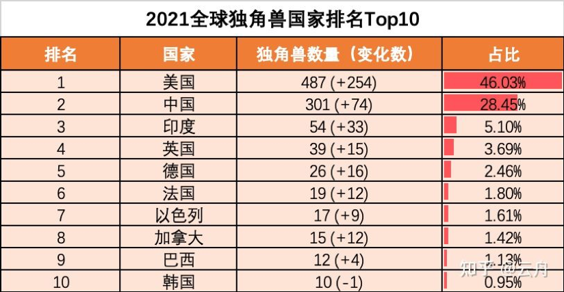 在所有的独角兽中,美国占比第一,中国占比第二。