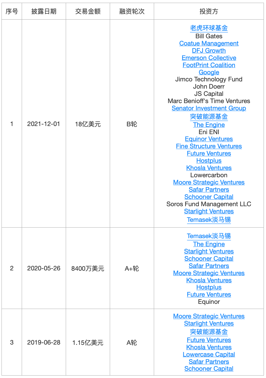 聚变能源服务商CommonwealthFusionSystems(CFS)成立于2017年,总部位于马萨诸塞州麻省理工学院,从事聚变机器的设计和制造,致力于将物理学与磁体技术相结合,以加速聚变能源商业化的道路。2021年12月,CFS宣布完成了18亿美元的B轮融资,由TigerGlobal领投,同时也包括来自比尔盖茨和马克贝尼奥夫的TimeVentures等知名人士的投资,用于将聚变能源商业化。投后估值达40亿美元,目前所有新能源公司都在争相创造无碳能源,而本轮融资是所有这些初创公司中规模最大的一轮。