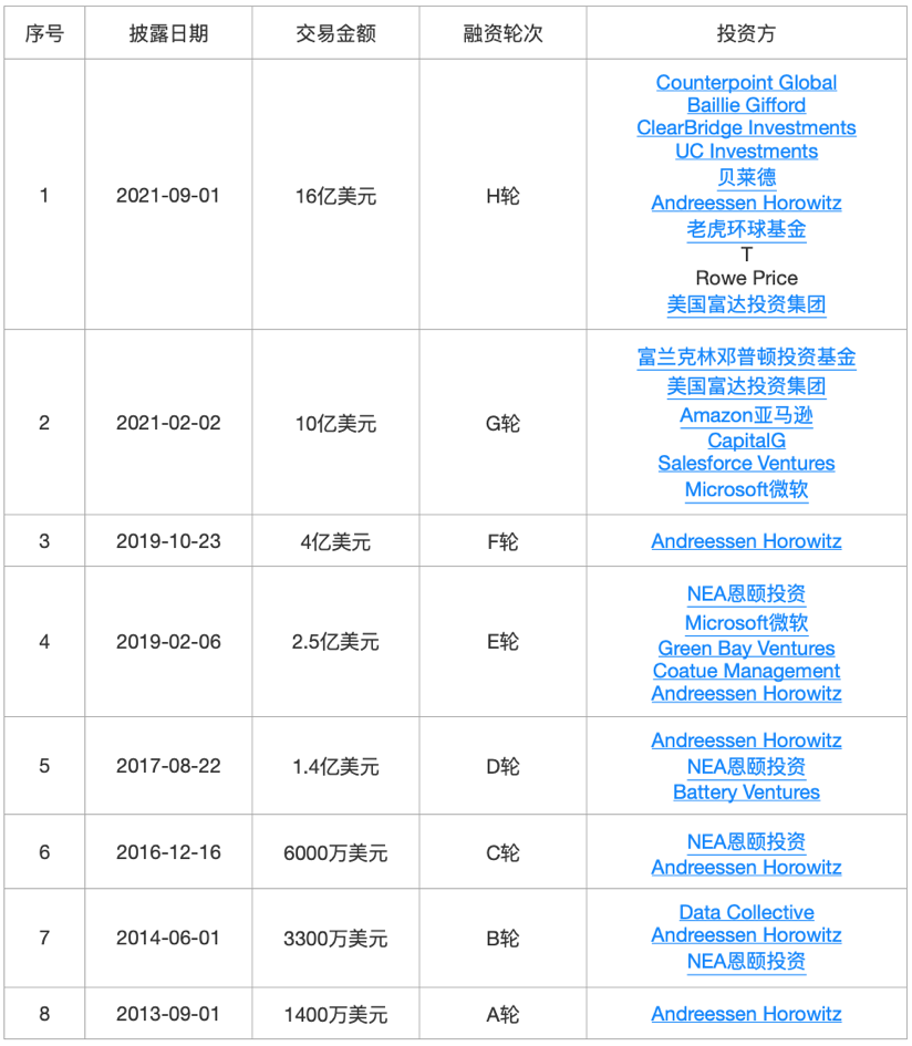 Databricks于2013年在旧金山成立,是一个基于开源的ApacheSpark大数据框架的统一数据分析平台,也是大型数据分析工具的最大供应商之一。除了Spark外,Databricks的产品还包括开发和维护AI生命周期管理平台MLflow、数据分析工具Koalas和DeltaLake。2021年9月,Databricks宣布获得由摩根士丹利的CounterpointGlobal领投的16亿美元H轮融资,本轮融资后,Databricks的估值已经飙升至380亿美元。