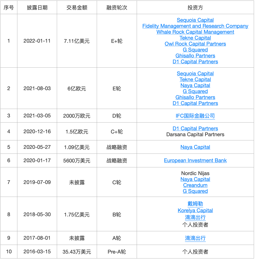 Bolt成立于2014年,总部位于美国旧金山。通过包括叫车、送餐和汽车共享在内的多式联运服务在城市提供无缝的端到端交通体验。2022年1月,Bolt宣布完成E+轮6.28亿欧元(约7.11亿美元)的融资,由红杉资本和Fidelity领投,公司估值达到74亿欧元(约84亿美元)。