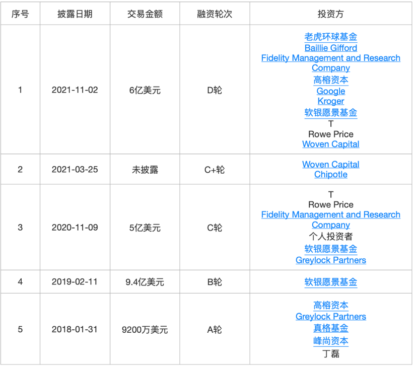 美国自动驾驶无人配送公司Nuro于2016年在硅谷创立,核心产品是自动驾驶配送车,用于餐馆、杂货店等场景的送货服务,客户包括沃尔玛、达美乐披萨、CVS等零售企业,目前,Nuro已经在德克萨斯州、亚利桑那州和加利福尼亚州的社区试运行了自动化本地配送服务。2021年11月,Nuro宣布完成了由TigerGlobalManagement领投的6亿美金D轮融资,最新估值86亿美元。