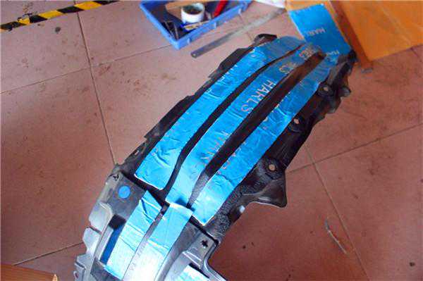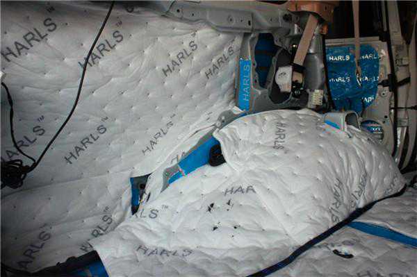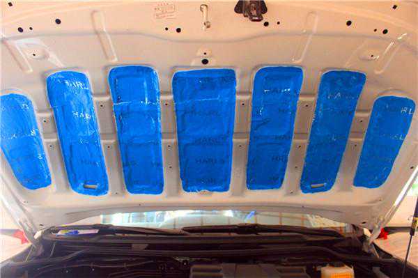 底盘第一层隔音,海利斯蓝金刚减震板,有效的抑止车身钣金的振动频率,减少300Hz以下的低频噪音!
